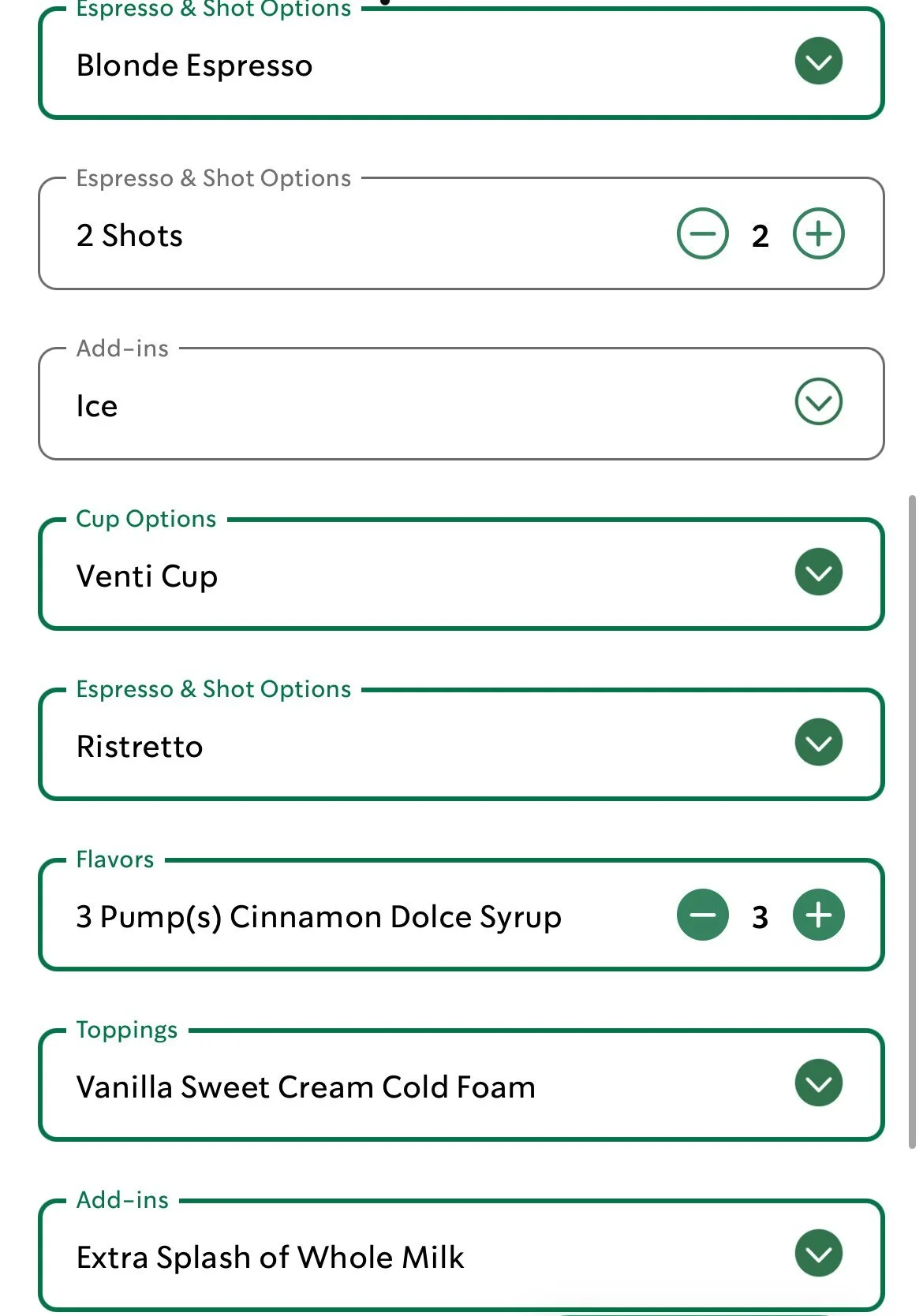whatever you do…DON’T FORGET TO PICK THE BLONDE, RISTRETTO ESPRESSO OPTION. this levels up every starbucks drink because it makes it so much more smooth! blonde = their lighter roast & ristretto = Italian for "restricted," uses less hot water when brewing the espresso to get a more concentrated flavor. this results in a stronger & smoother shot.
