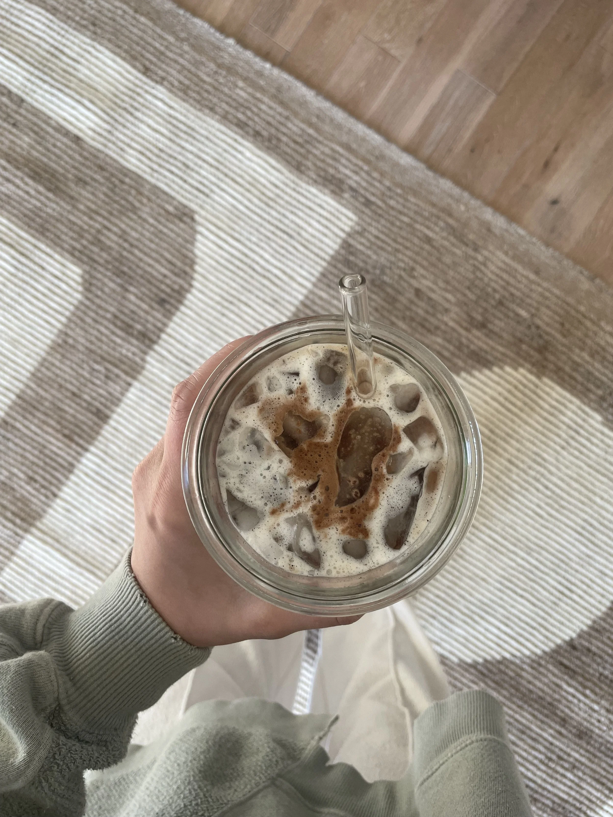 in a cold foam frother, add about 8oz of whole milk, pinch of vanilla bean powder, & 1.5 tbsp of maple syrup to the pitcher & froth until fluffy & combined!